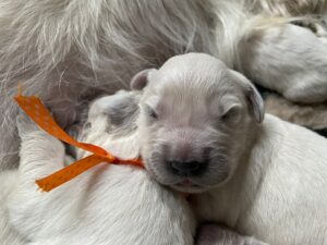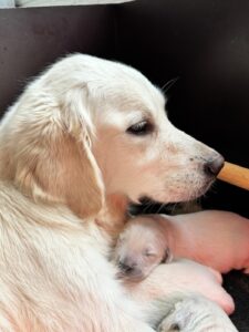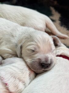Die Welpen sind nun zwei Wochen alt und entwickeln sich prächtig. Sie haben sichtbar an Gewicht zugelegt, wirken rundum zufrieden und genießen die ersten gemeinsamen Tage in vollen Zügen. Schlafen, Trinken und Kuscheln stehen weiterhin ganz oben auf dem Tagesplan.
