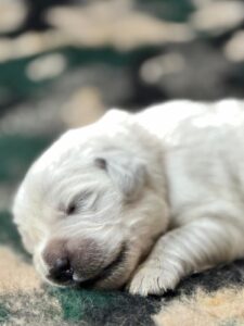 Langsam kommt Bewegung ins Spiel: Die Welpen robben neugierig durch die Wurfbox, strecken sich, schieben sich gegenseitig an und reagieren zunehmend auf ihre Geschwister. Die Augen beginnen sich leicht zu öffnen und erste zarte Pigmentierungen an Nase und Pfoten sind gut erkennbar.