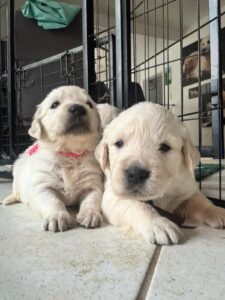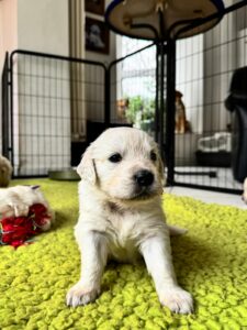 In der vierten Woche hat sich der Alltag der Welpen spürbar verändert. Der Aktionsradius wurde erweitert und wird nun mit großer Begeisterung genutzt. Es wird gerannt, geklettert, durch Tunnel gekrabbelt und mit allem gespielt, was sich bewegt – die sozialen Kontakte untereinander nehmen dabei deutlich zu.