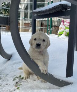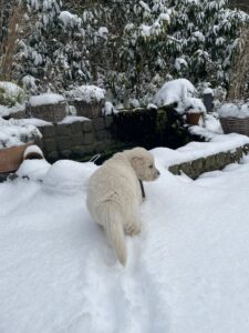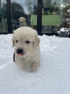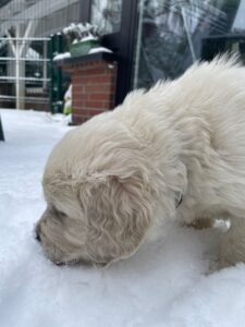 Ein besonderes Erlebnis in dieser Woche: Der erste Schnee. Neugierig und voller Begeisterung haben die Welpen die weiße, kalte Überraschung erkundet, sind darin herumgetollt und haben den neuen Untergrund aufmerksam untersucht.